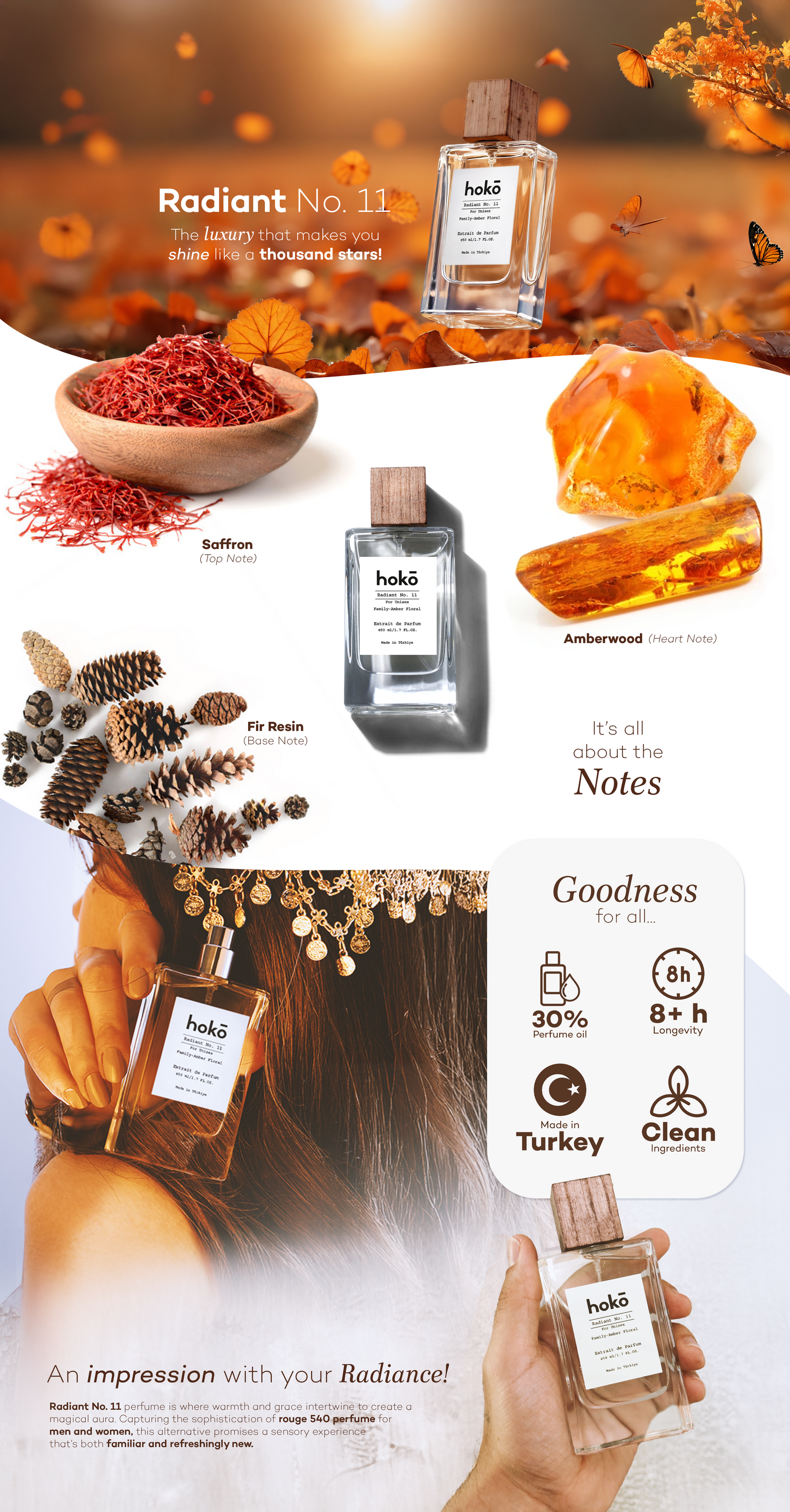 We take pride in crafting quality fragrances with premium smells. While not exact replicas, hokō fragrances are precisely formed to capture the shadow of beloved designer scents, giving you an endless luxurious experience at an affordable price. By using the notes of Baccarat Rogue 540 perfume for men and women, Radiant tries to mirror its original sweet, charming essence.